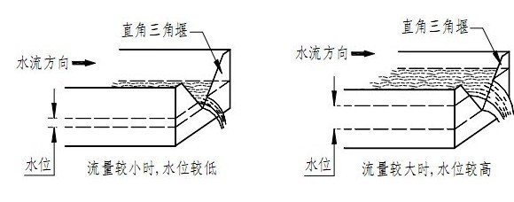 流通顺畅的明渠内流量越大,液位越高;流量越小,液位越低(如下图)。通过测量水位可以反算出流量。普通明渠内流量与水位之间的对应关系,受渠道的坡降比和表面的糙度影响。在渠道内安装量水堰槽,产生节流作用,使明渠内的流量与液位有固定的对应关系,这种对应关系主要取决于量水堰槽的构造尺寸,渠道的影响减小至最小。