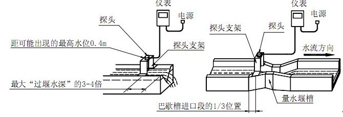 超声波明渠流量计的探头可以直接安装在量水堰槽水位观测点的上方。探头发声的一面要对准水面。可以用水平尺放在探头上盖上,通过校上盖水平使探头对准水面。巴歇尔槽水位观测点在距喉道2/3收缩段长位置(如图);三角堰、矩形堰在上游一侧,距堰板3~4倍最大过堰水深处